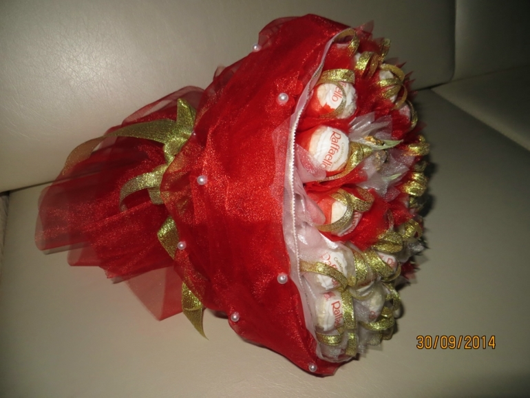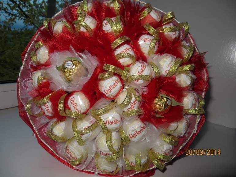 Дв девчата !!! Сотворился для нашего классного руководителя букетик на День Учителя! Букеты из конфет с гофрой дарили лично ей сами несколько раз, теперь решили от класса подарить! Остановились на чисто конфетном. Ушло 2 пачки рафаэллок . Вот что получилось! Извините за фото :) фотографировала уже вечером.