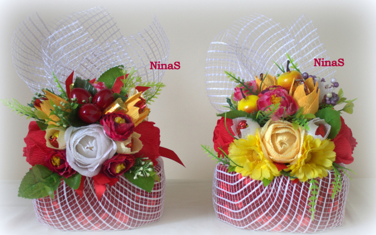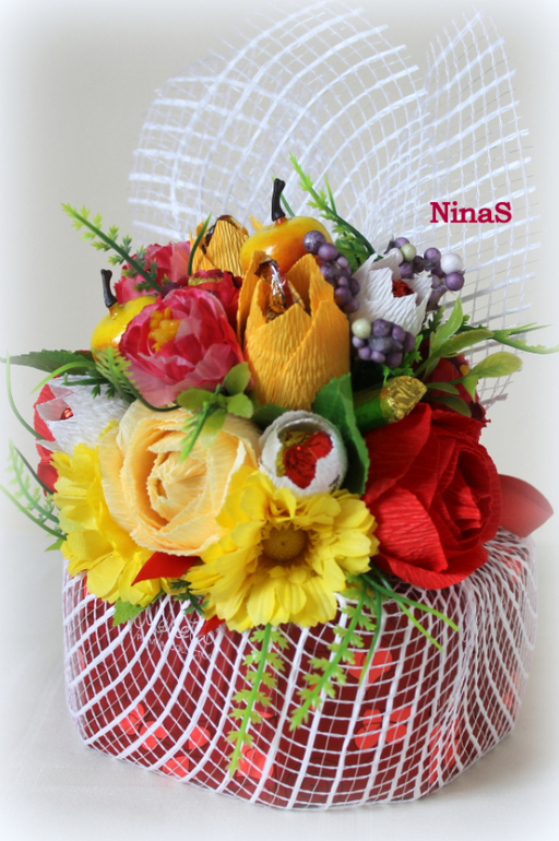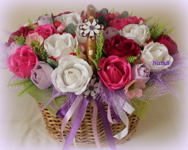 Нина, работы у Вас просто восхитительные!!! А корзинка — вообще прелестная, глаз не оторвать! Подскажите, пожалуйста, где Вы покупаете гофру, сетку и декор? Я тоже из Краснодара, покупаю на Шевченко (оптовая база). Но там выбор гофры не большой, красный цвет какой-то странный (я бы назвала его бордовым), а Ваши розы такого красивого, насыщенного цвета!