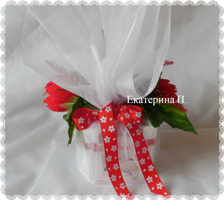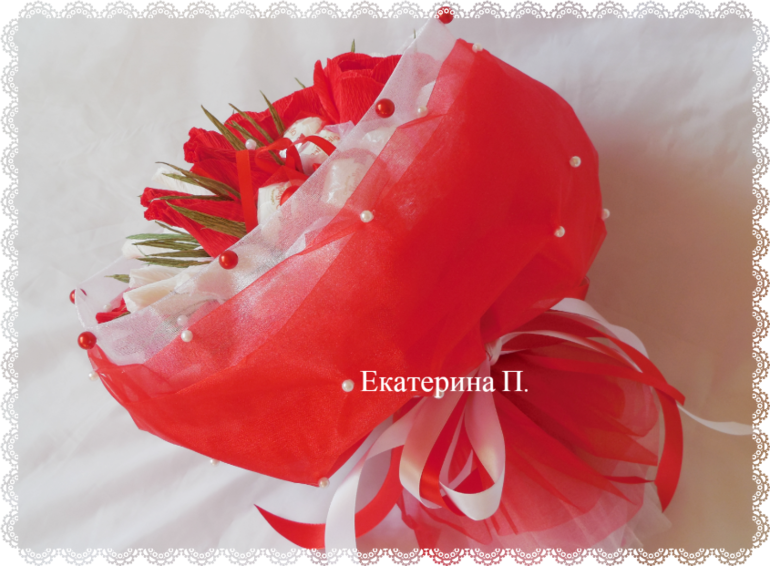 И еще букет преподавателю. Делала уже такой, здесь скомбинировала белую и красную органзу в упаковке.