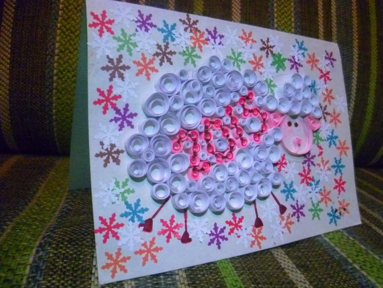 Полоски белой бумаги шириной 5мм накручиваем на шило или зубочистку. Снимаем с зубочистки, немного ослабляем и закрепляем кружочек на клей ПВА. Делаем много таких кружочков — шерстка овечки. Набросала карандашом на листе рисунок овечки, а потом на клей ПВА наклеили кружочки. Снежинки специальным таким дыроколом делали — панч вроде называется. Посмотрите в интернете если будут вопросы, это называется квиллинг.