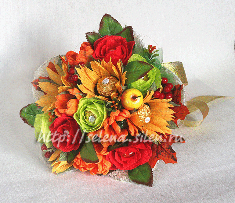 А старший носил такие букеты (только чуть увеличенные по кол-ву конфет)
