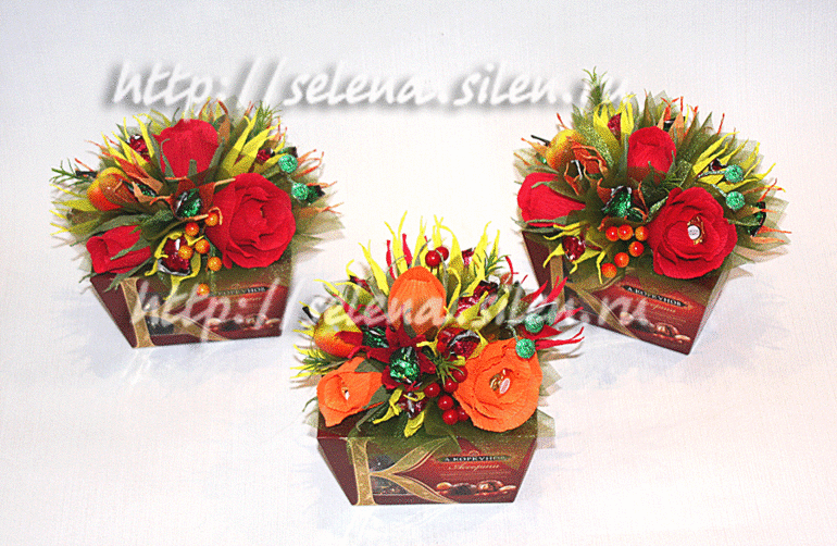 И украшалочки конфет Коркунов. Младший сын дарил воспитателям на их профессиональный праздник. Они у нас еще не балованы букетами, поэтому начали скромненько )))))