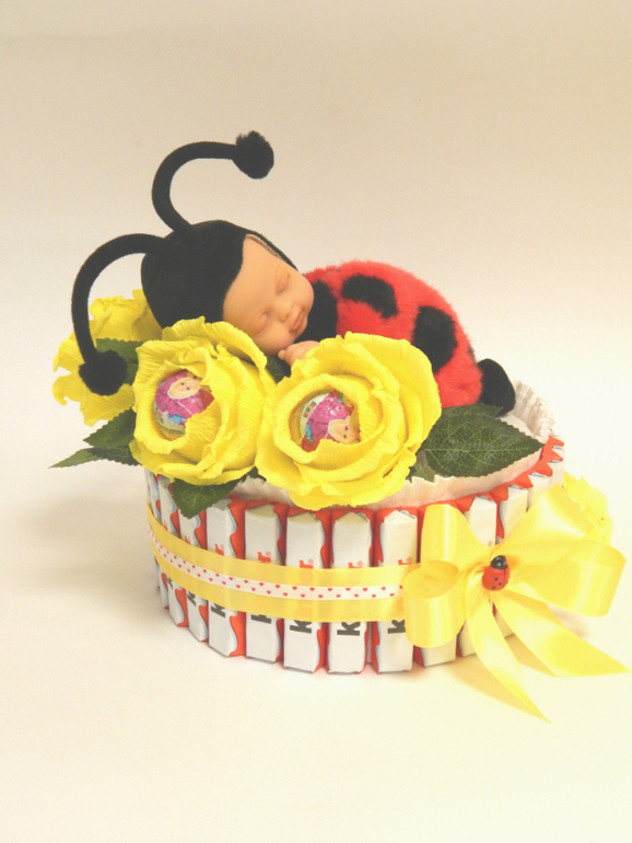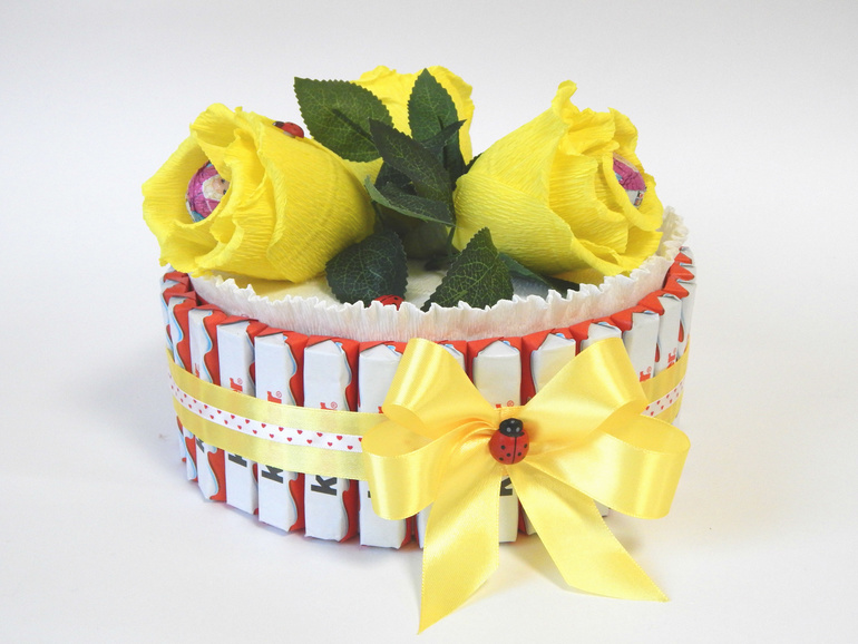 Я тоже сначала так хотела сделать. Но у этих шоколадных яиц розовая обертка, а в композиции преимущественно красный цвет. Вот я и решила обернуть их в желтую гофру, но форма у цветка получилась не очень удачная.