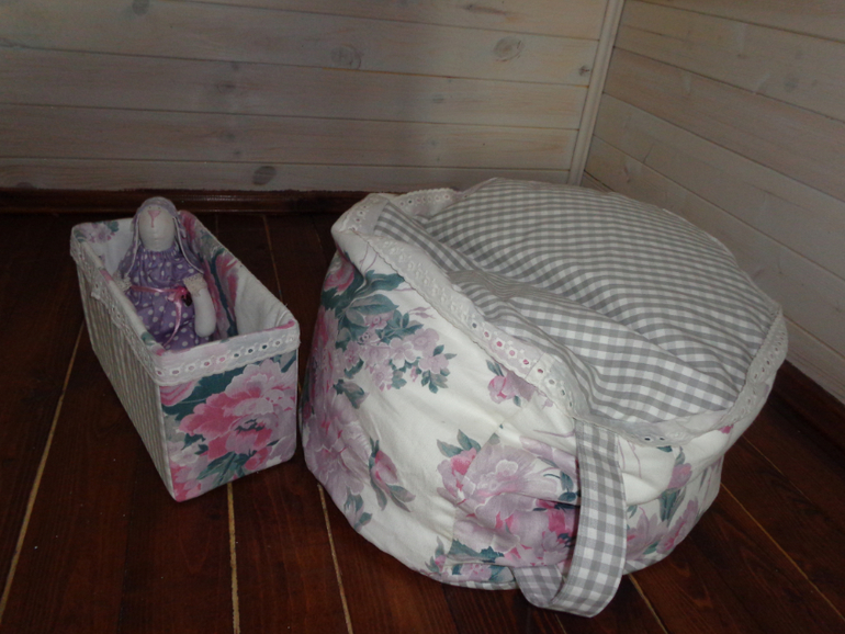 Коробку взяла обычную картонную и обшила тканью-сшила на нее чехол внешний и внутренний, их вместе сшила, надела на коробку, потом дно с 3 сторон прострочила изнутри, а 4 сторону уже потайным швом вручную. Внутри пуфика шарики пенополистерола