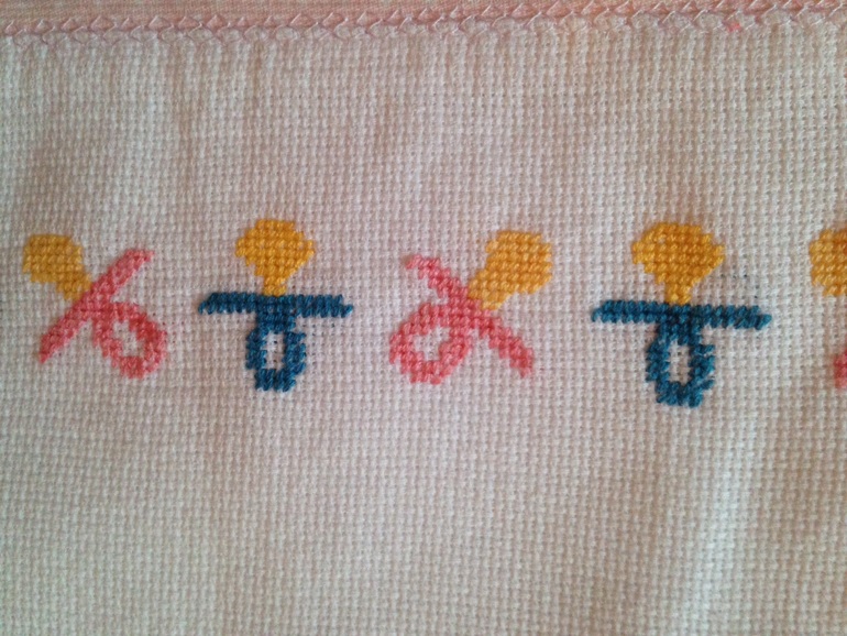 А так как для новорожденного всегда хочется что- то миленького кроме кружавчиков и рюшечек, то родилась задумка сделать кайму из пустышек, на которую ушло почти половины времени