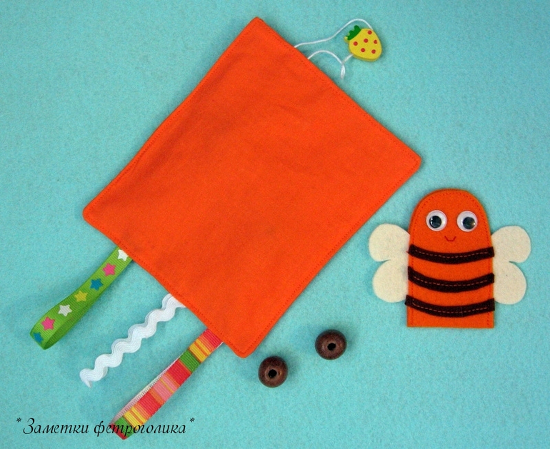 небольшой бонус - грызунок из хлопка с лентами и двумя деревянными бусинами внутри, прочно прошит двойным швом и пальчиковая игрушка пчелка.