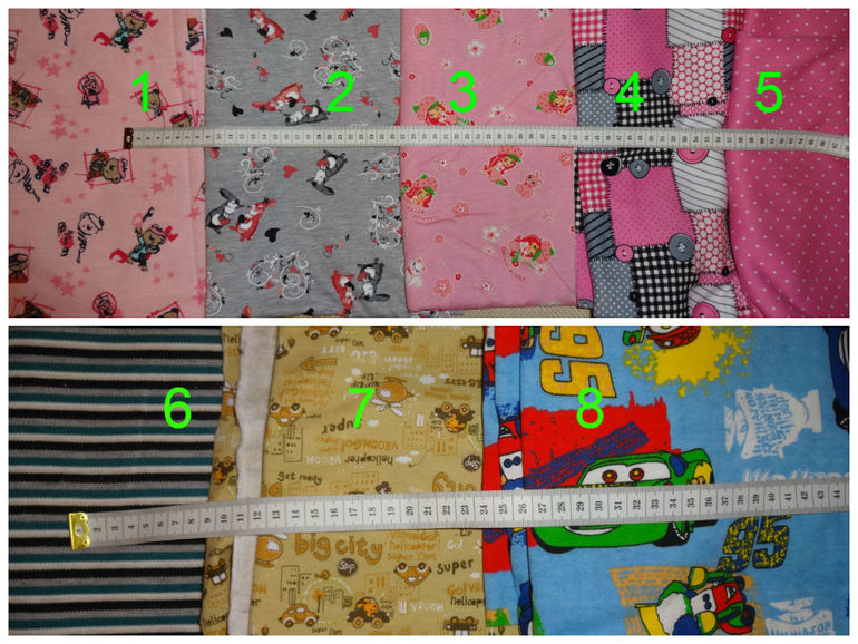 Номера 1,7,8 - футер трехнитка с начесом, 2,3 - кулирка, 4,5- интерлок, 6 - интерлок с начесом (очень мягкий и эластичный). размеры - под кат