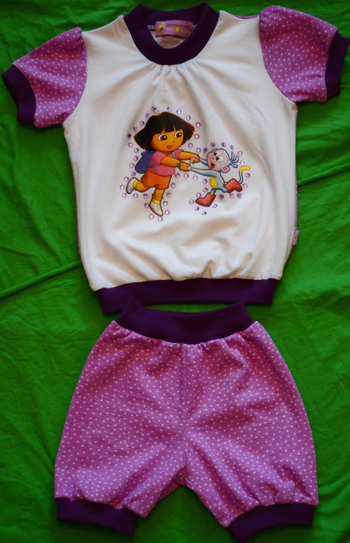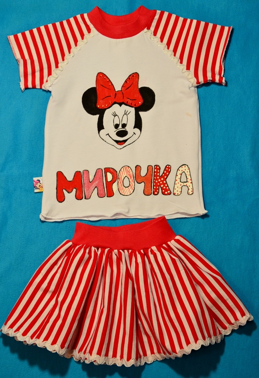 Отличная работа! Особенно мне нравится первый комплект и последний. Где термотрансферт с Дашей покупали? Снуд и шапочка оригинальные.