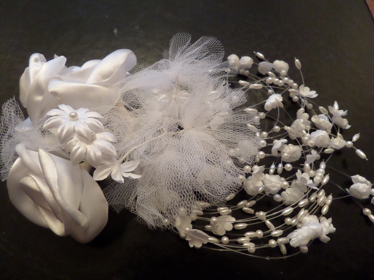 В-четвертых, свадебные аксессуары - венок большой (на гребешке), венок маленький (на гребешке), букетик.