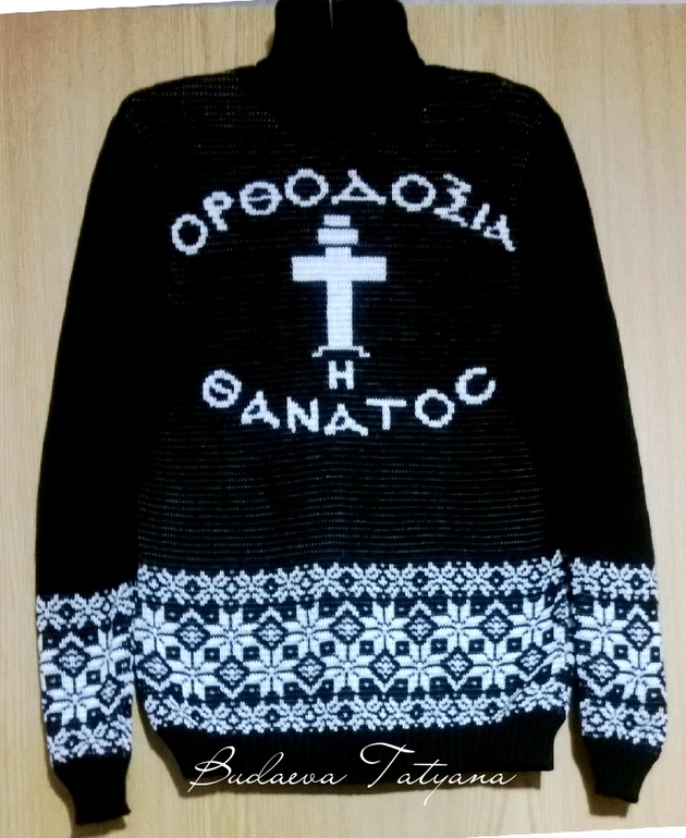 Спасибо!Свитер связан на заказ,по этому это не моя прихоть.Это молодёжное веяние,а переводится "Православие или смерть".У меня табу на фашистскую свастику,а всё остальное вяжу.