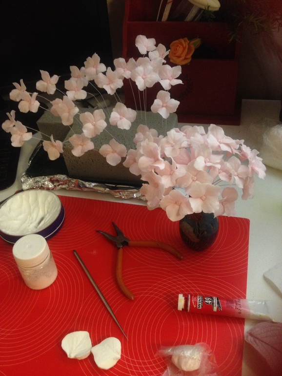Но лепить все таки начала по-немногу. Вот что на данный момент. 59 цветочков гортензии, но для моей задумки нужно еще раза три по столько)))) так что я только на начальном этапе. Каждый лепесток выполнен полностью вручную, использовала только стек и молд.