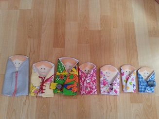 А это наши матрежки застежки, для того чтоб маленькие пальчики учлись застегивать и растегивать ) тут замочек, шнуровка, пуговки, кнопки, крючки, липучка и карабин