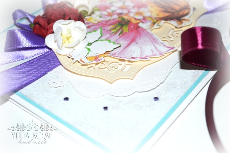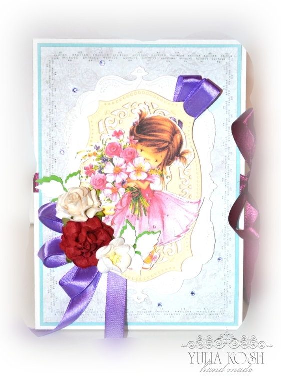 СкрапбукингИ у меня сложилась открыточка очень многослойная с миленькой девчушкой, которая не хочет прощаться с летом , украшена декоративной строчкой, вырубкой, цветами, стразами и завязывается на атласную ленточку!