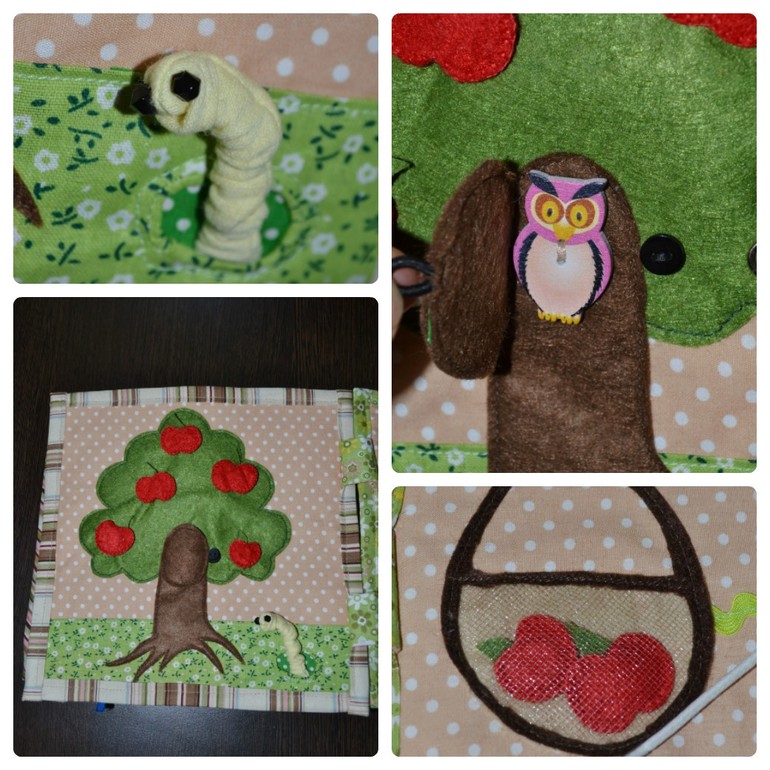 Червяк на резинке, яблочки на кнопках и убираются в корзинку, к которой идет ежик