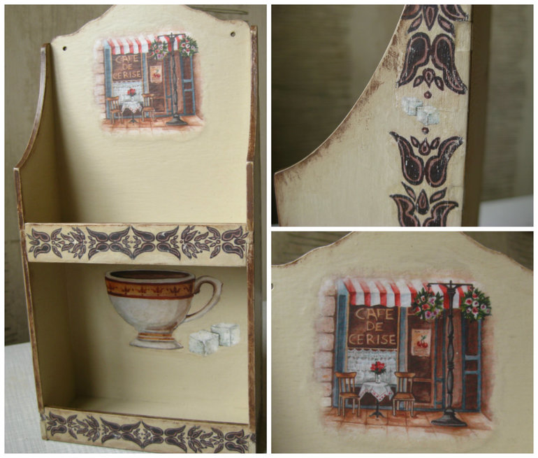 ДекупажУ подружки скоро новоселье, вот скумекала полочку такую. Мотивы она сама выбирала, не было в магазине ничего со специями вообще, хотя магазин огромный, и выбор там нереальный! Но жаль...