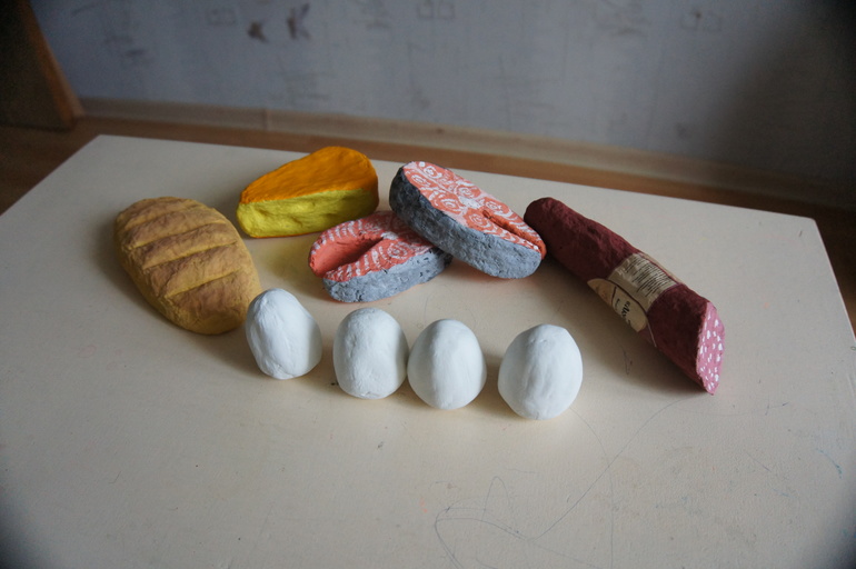 Изделия из бумаги, папье-маше, квиллинг.С папье-маше работала в первый раз, подтолкнуло меня к этому отсутствие в магазинах пластиковых продуктов для детского магазина в сад.