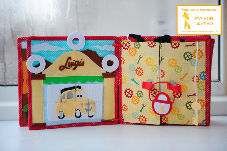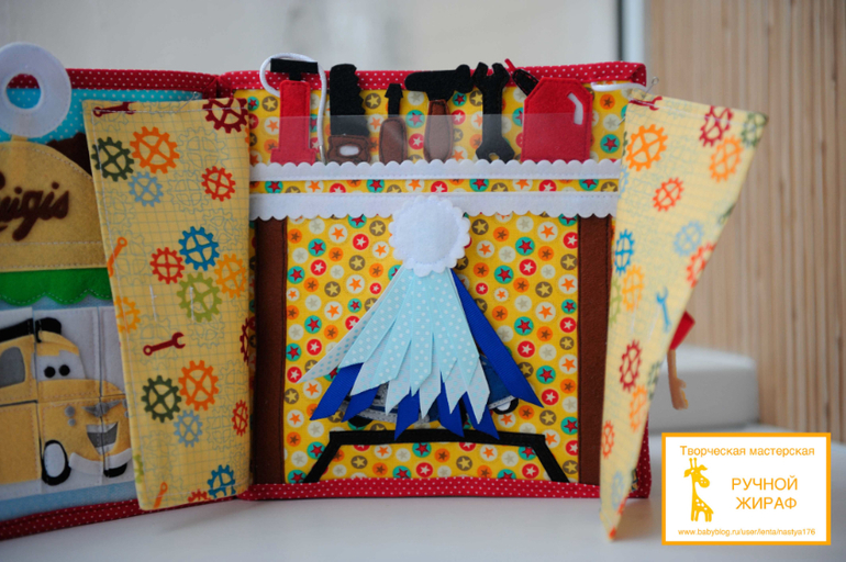 1. Обложка с Маквином , На корешке есть бензоколонка с пистолетом. Тянем за пистолет и шланг вытягивается, тянем в другую сторону - шланг сматывается. У маквина есть бензобак для заправки. Книга закрывается на пуговку с петелькой.