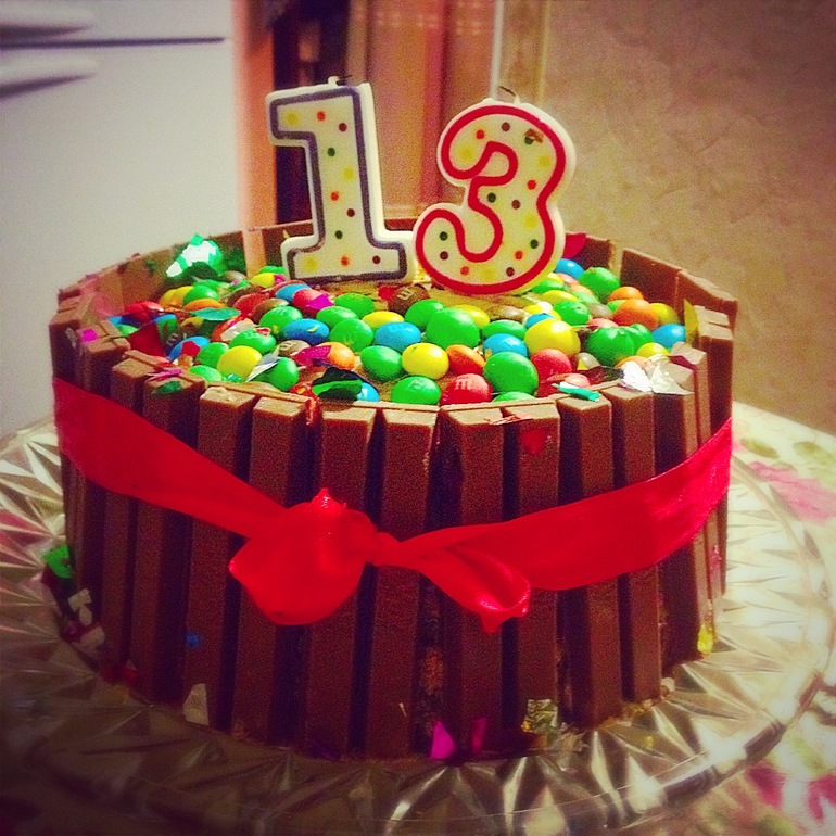Внутри - торт "Прага" (собственного исполнения), вокруг по борту "КитКат", сверху "M&m's"