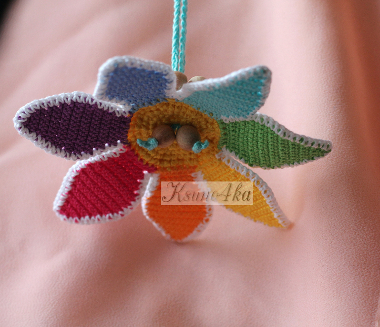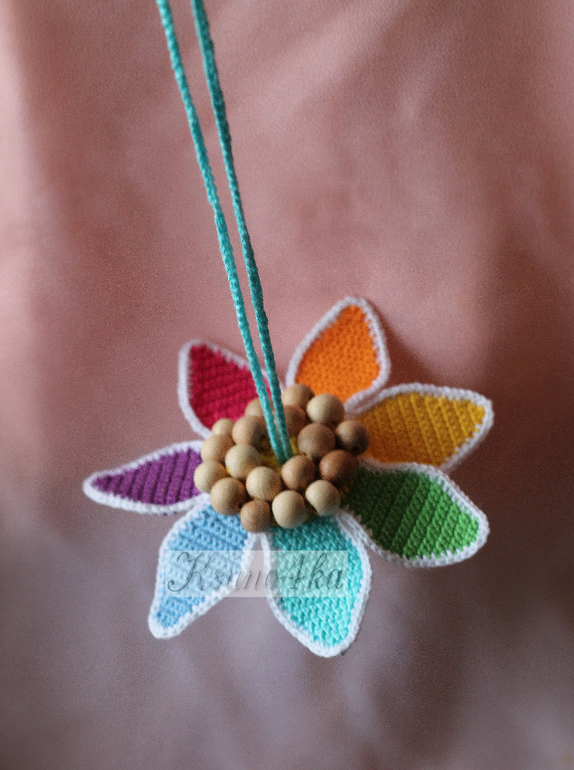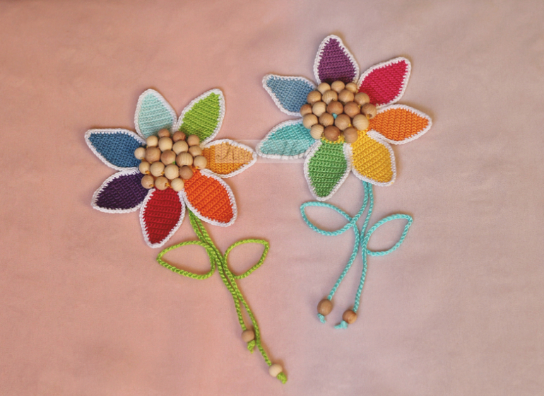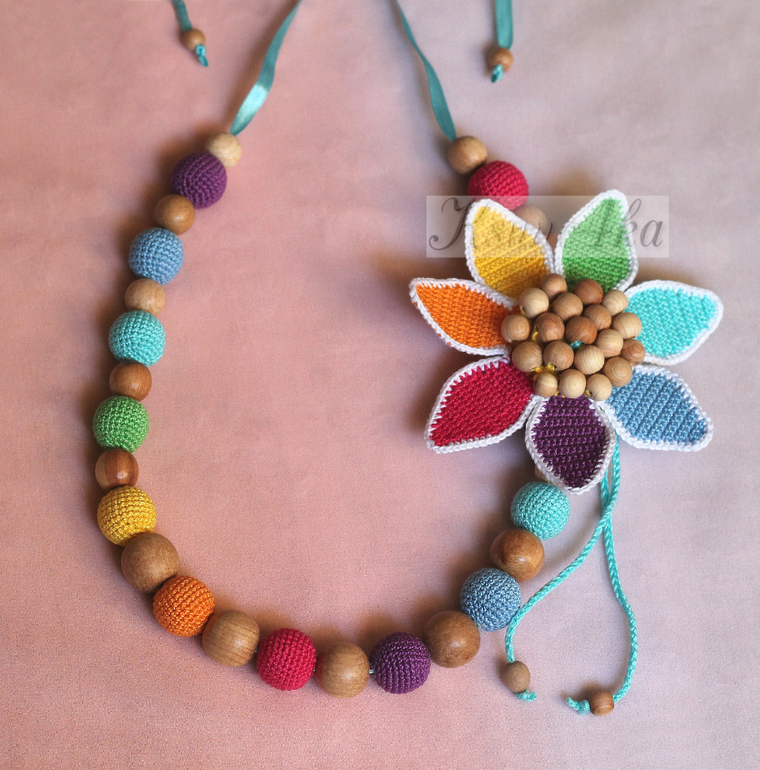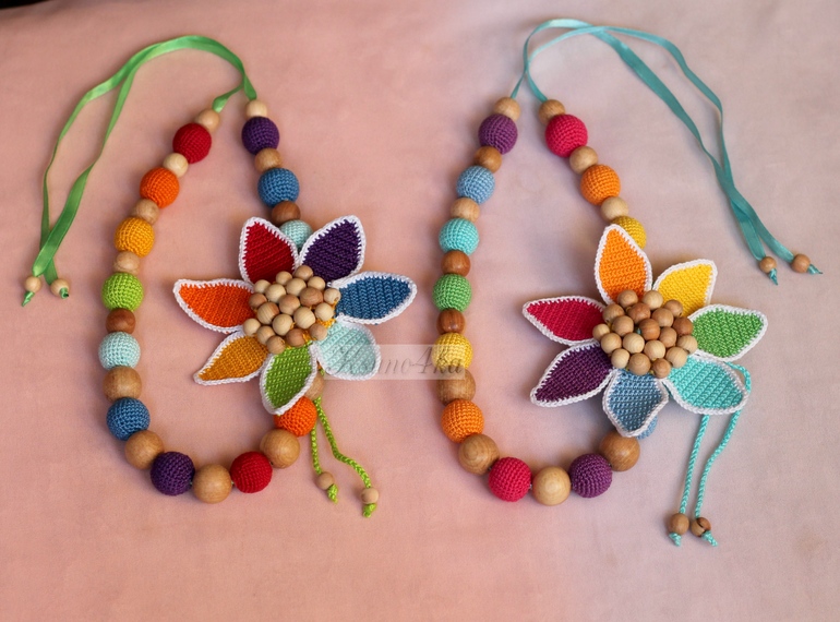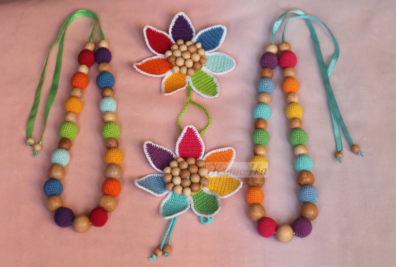 Пока я вязала эти слингобусы, подумала, что цветок можно использовать не только как украшение для бус, браслет на детскую ручку, но и в качестве подвески для коляски или кроватки.