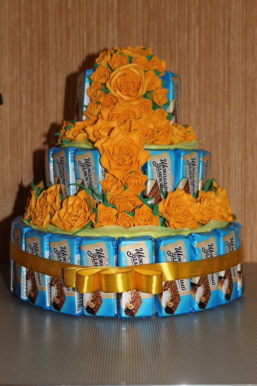 Красиво очень! Розы высшие) можно еще было оранжевой гофрой конфеты закрыть.