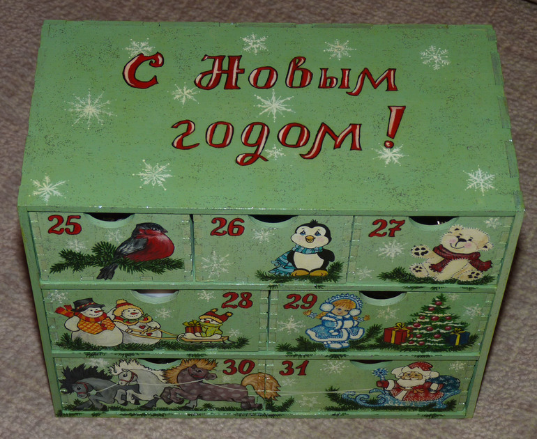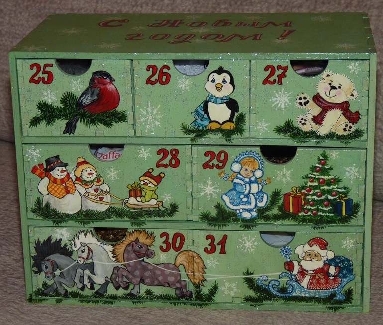 Комод на 7 ящичков, для последней недельки декабря, каждый ящичек со своими персонажами. Мне очень жаль, что я не профессиональный фотограф, чтоб передать вам более точно всю прелесть..