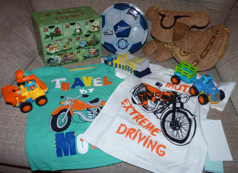 Для моего котенка еще 2 классные футболки с мотоциклами, носочки, машинки и для нашего папочки - печенье "Зенит"))