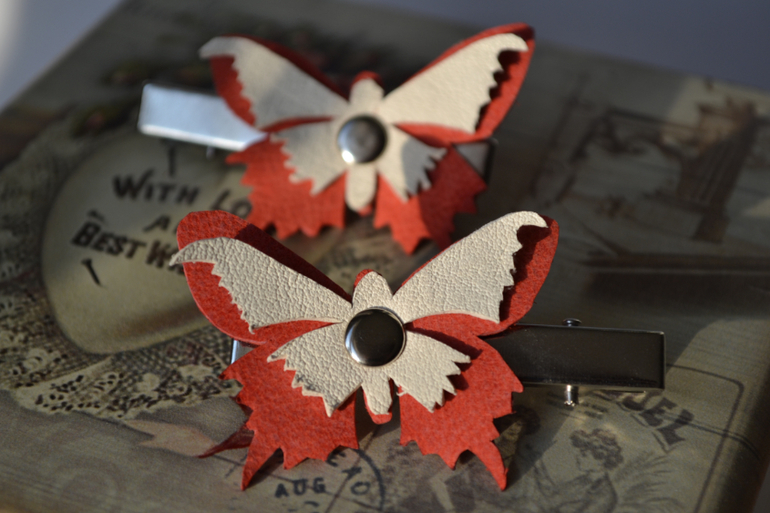 Изготовлены из натуральной кожи, приклепаны к основе-заколке, вторая бабочка- это выжигание по коже