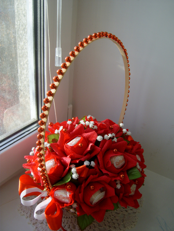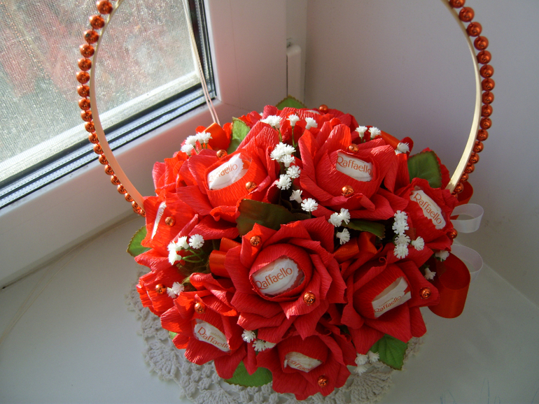 где все закупились? я тоже хочу (нельзя, но хочу! )))по букету - шикааарный. одно но, сама ненавижу рафаэлу за ее форму. то ли на фото так получилось, но серединка квадратная. может в следраз повыше лепестки крепить?