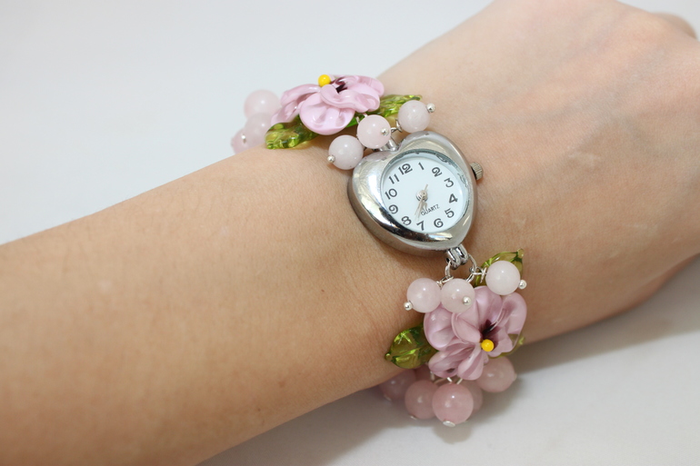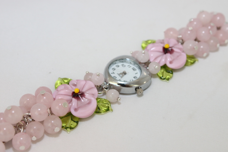 Часы "Анютины глазки" (розовые) Фурнитура под серебро, розовый кварц, авторский лэмпворк