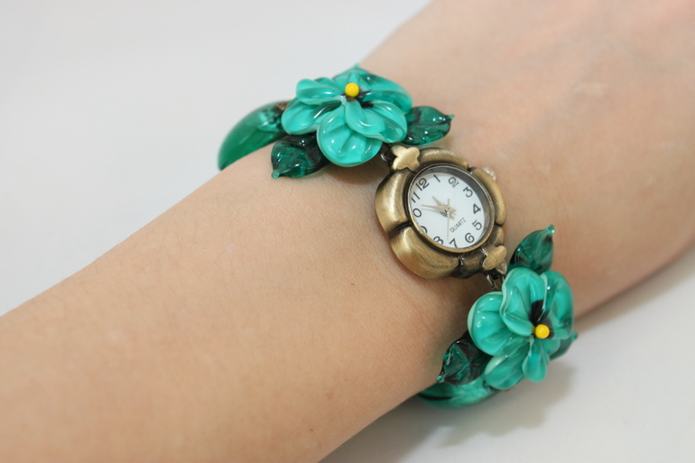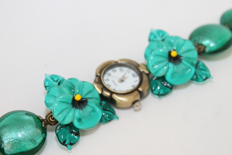 Часы "Анютины глазки" (мятные) Фурнитура под бронзу, кварцевый механизм, стеклянные бусины, авторский лэмпворк