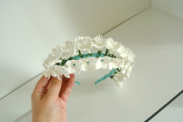 Ободок сделан не из холодного фарфора, а из Деко глины, она немного другая, мне больше понравилась! Но и цветы выглядят с ней искусственными!