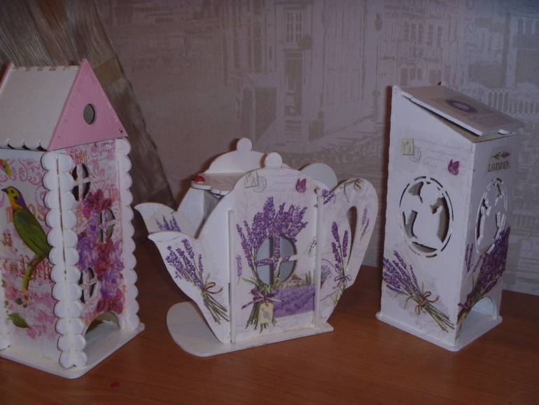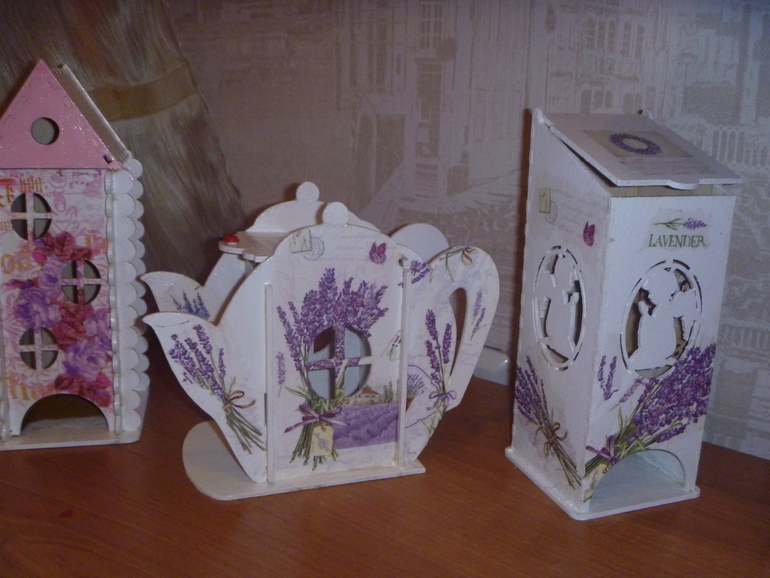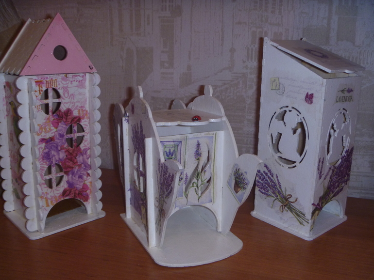 Поздравляю с почином! Неплохо получилось! Заготовочки такие интересные! Недочёты и у меня есть,будем учится дальше декупажу.Сама сегодня доделываю домик на подарок,давно ничего не делала,не было настроения,да и самочувствие не очень