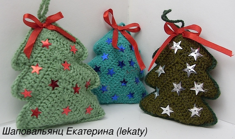 Вязаные елочки-подвески - то самое украшение, которое будет смотреться стильно, оригинально, современно и по-домашнему тепло и уютно, как на новогодней елке, так и в новогодних композициях или гирляндах. Они отлично впишутся в любой интерьер. Размер ёлочек 10-13 см, материалы: акрил, холлофайбер, пайетки, атласная лента. Елочки были связаны на благотворительную ярмарку)