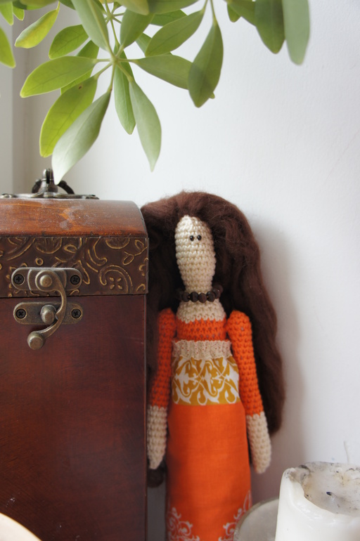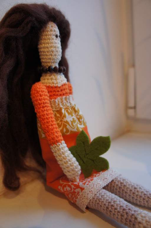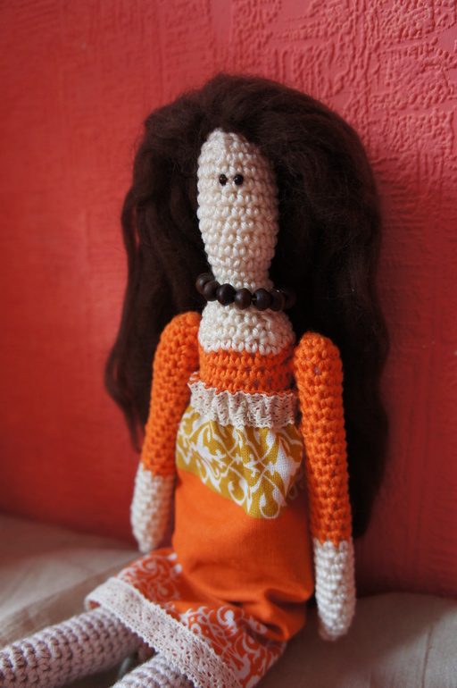 Связана крючком 2.6 из хлопковой пряжи трех цветов. Глаза - чешский бисер. Волосы - шерсть для валяния.