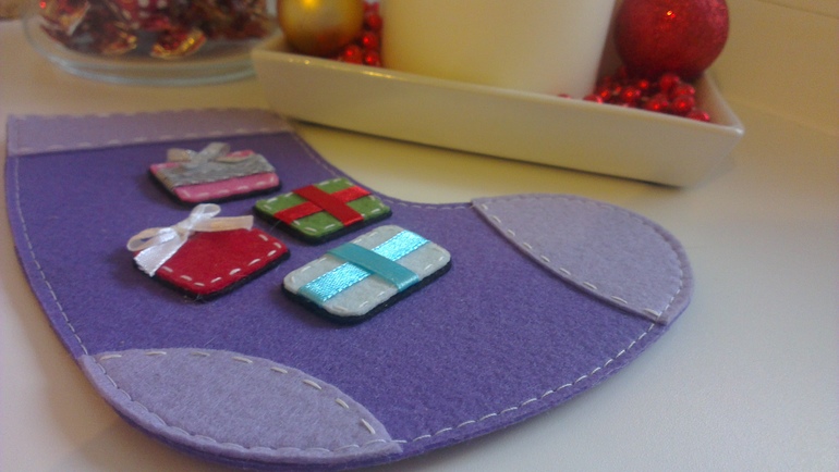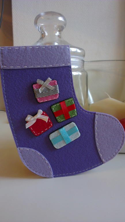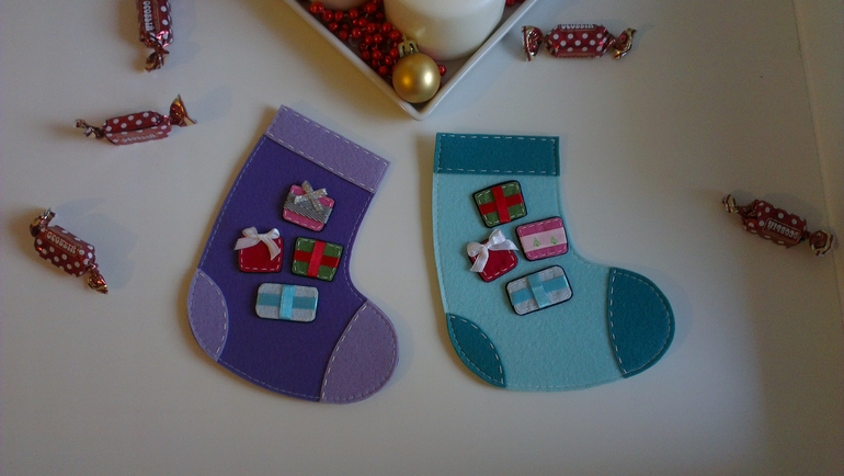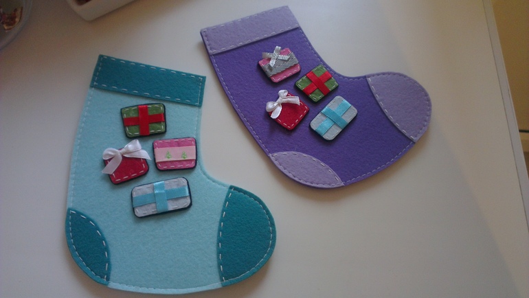 На носочке, сверху, не конфеты, а имитация подарочков из фетра, они приклеены, а внутрь носочка можно положить любые конфеты)
