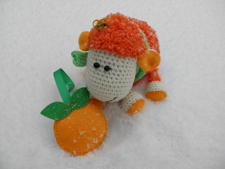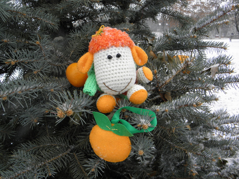 Связана из ниточек "Нирвана беби" и "Джинс",набита синтепоном,глазки-бусинки,копытца и ушки продублированы фетром,а кудряшки украшает деревянная пуговка-цветочек.Размером около 15см.Несёт с собой хорошее новогоднее настроение и ароматную мандаринку,которая украсит новогоднюю ёлочку)