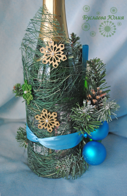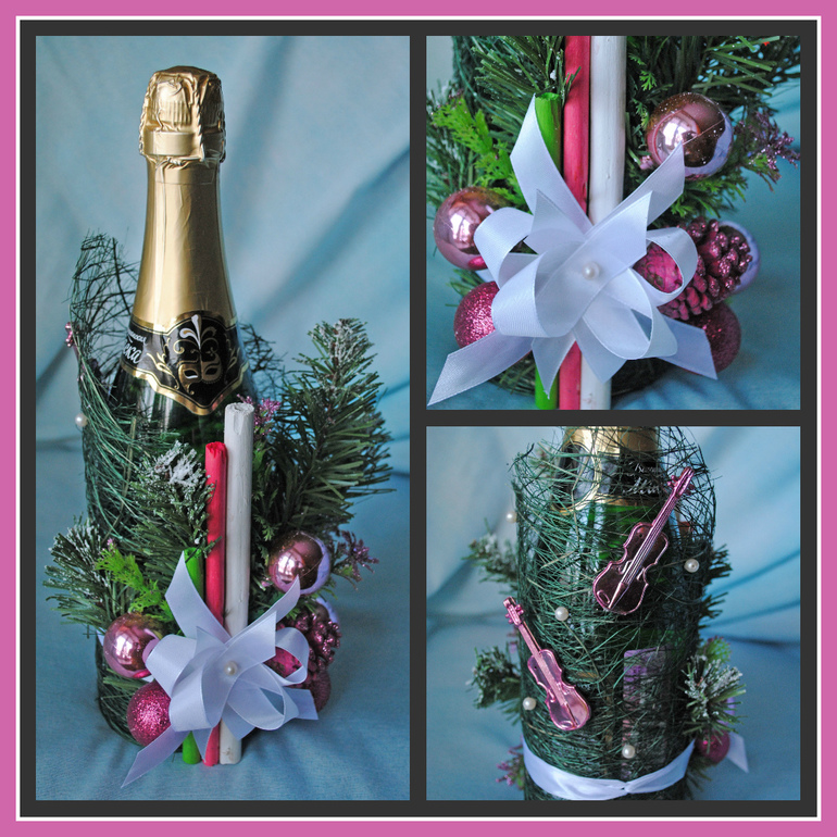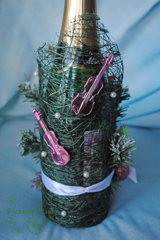 Сегодня покажу свои вариации на тему декора бутылок (без конфет). Надеюсь, модераторы меня не побьют, но в других категориях почти никого не знаю. Оправданием считаю моё желание выложить фото украшенной коробки конфет, но выяснилось, что плоские и большие предметы фотографировать не умею. Получается ужасно скучно и не объемно. Придётся учиться искать интересные ракурсы для фото плоских коробок с конфетами.