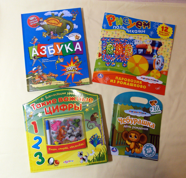 Пока убрала в шкаф, он не дорос до них, на день рождения (в марте) презентую. я сама готова в этих книгах всё рисовать и наклеивать))