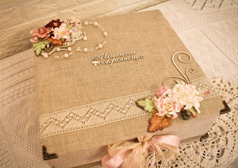 СкрапбукингМой первый опыт в скрап технике, делала для себя. Хотелось коробочку в стиле шебби-шик. Благо дома имелся запас обрезков ткани и настоящего винтажного кружева.