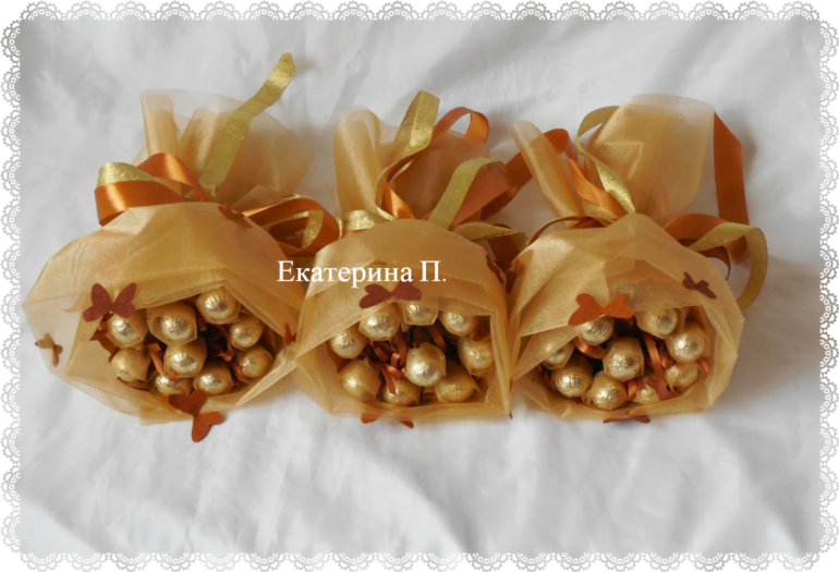 Повторы букета "Золото и шоколад". Только сетки не было, сделала в органзе. Букетики уехали в Махачкалу )))