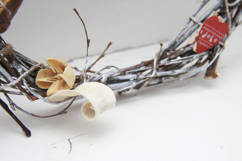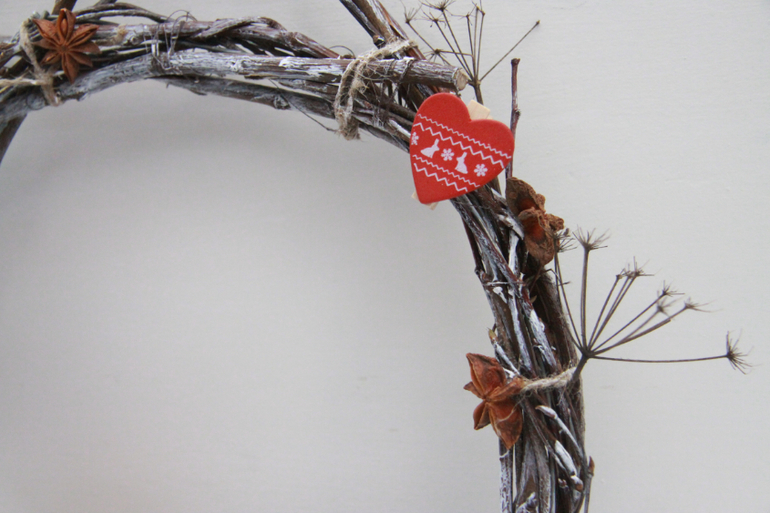 Мы живем в своем доме поэтому срезать ветки разных плодовых деревьев не проблема, что я и сделала. Сформировала из них круг скрутила проволокой и оставила. Через неделю я отыскала в своем доме все, что только можно, разные сухоцветы, шары, веревки. На днях когда гуляла с сыночком я собрала веточки которые мне приглянусь из под снега. Оказывается что их так много и они такие красивые на фоне снега так и говорят "возьми меня"! )))).