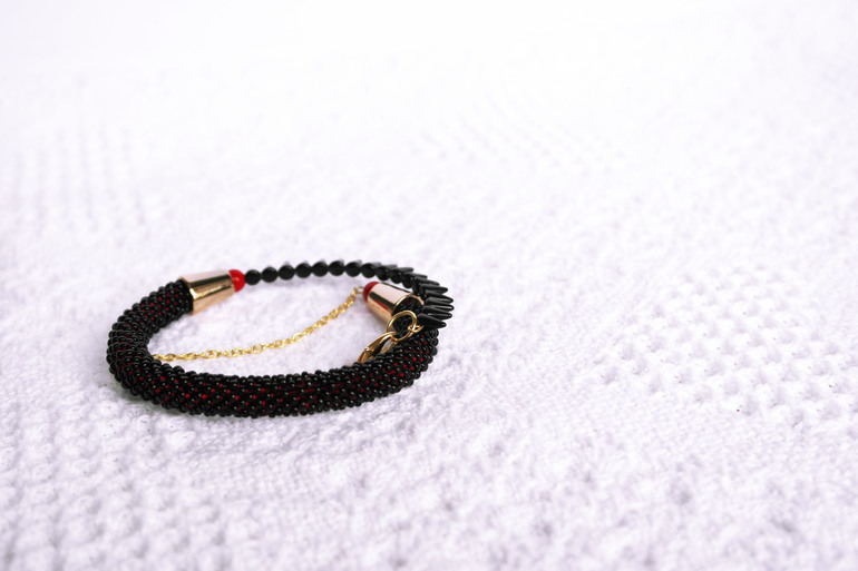 Да простит мне известный бренд - браслет "Лабутен" вашему вниманию)) Классический черный, где-то даже агрессивно-строгий из-за шипов, он просвечивает роскошным ярко-красным, тоже очень классическим. Собран на позолоченной проволоке-мемори, страхующая цепочка тоже позолоченная.