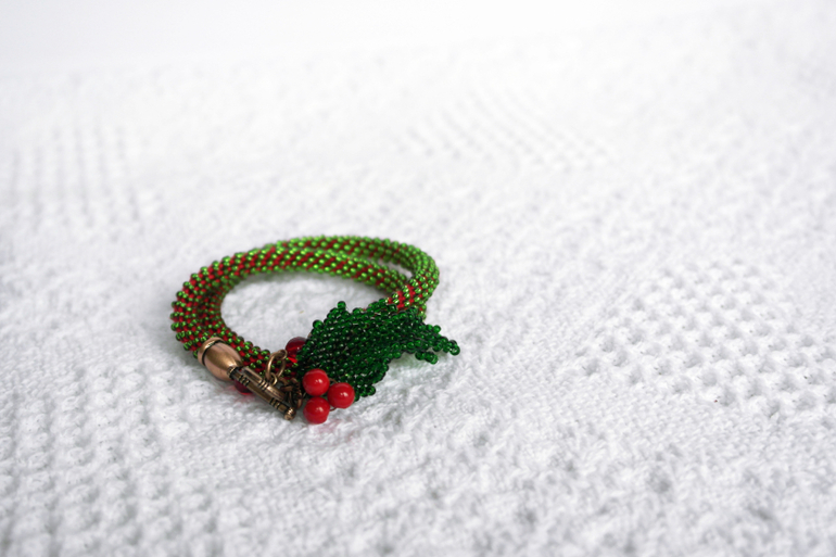 Браслет-намотка "Дух Рождества". Маленькое собрание рождественских атрибутов, здесь и красные ягодки, и листок остролиста, и блеск начищенных медных ручек))