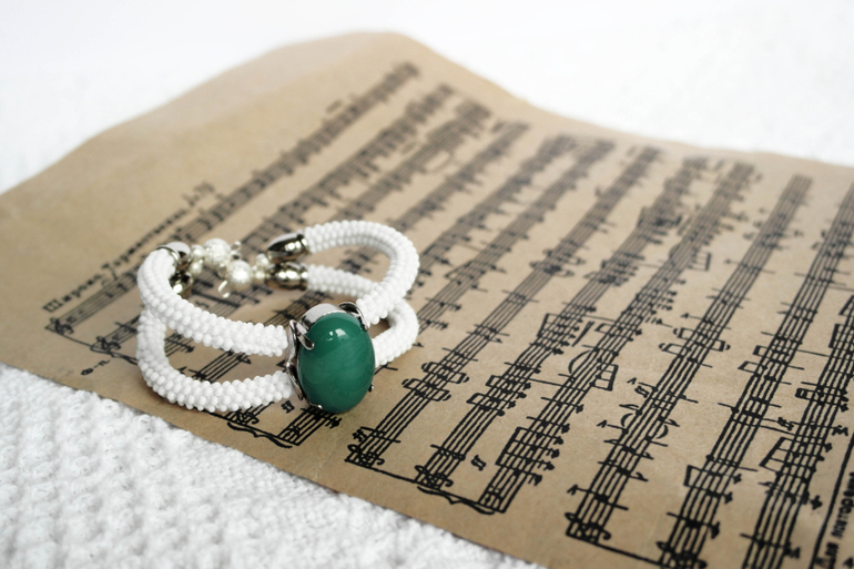Браслет "Нефрит". Центральный элемент - агат очень красивого сине-зеленого цвета, белоснежный чешский бисер.
