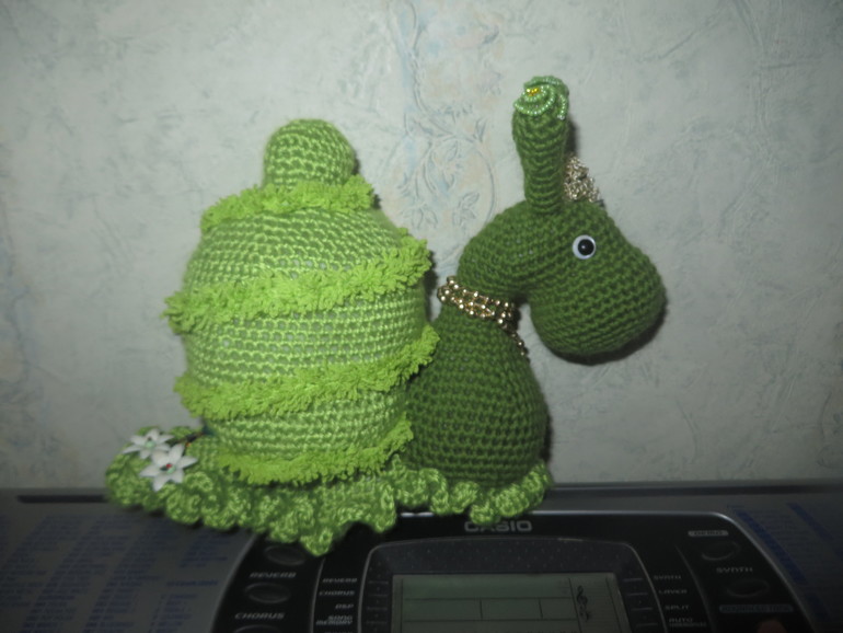 Копнула свой сундук залежей, откопала остатки зеленых ниток. Хотела связать ёлочку, но мне на глаза попалась улитка Аннет (вязала по МК Дианка с форума амигуру, с небольшими изменениями). У подруги ник - Green Snail. Решила связать ей в подарок на день рождения улиточку, вязала довольно безалаберно по исполнению, в основном "между делом". То в бассейне, когда ждала Бамбину, то где-то еще. Дома - только сборка и оформление. Оформила тоже еще не до конца. У оригинала есть ручки и жилетка, но мне они кажутся излишними...