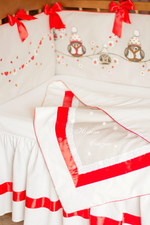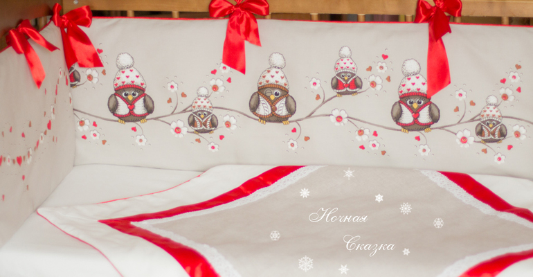 Ткань с совушками - это плотный 100% хлопок, обратная сторона бортиков - натуральный лен. Такие бортики очень хорошо держат форму. Атласные банты - завязки можно завязывать с внутренней стороны кроватки или с внешней - по настроению. Бортики состоя из: чехлов на потайных молниях и внутренних подушек. Такие бортики легко стирать.