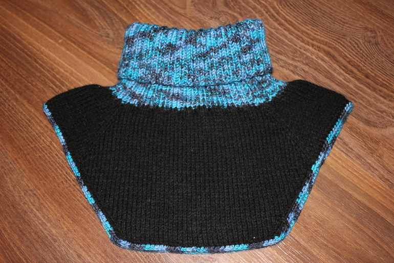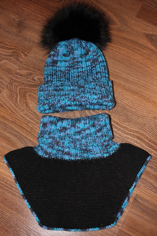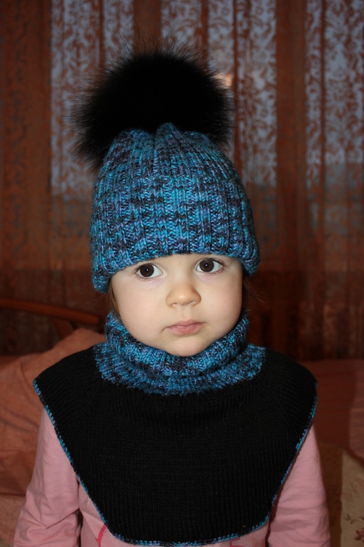 Шапка и отворот манишки связан в две нити, черная ниточка Пряжа из Троицка Кроха.