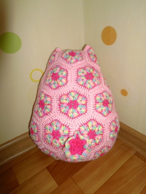набивала синтепоном или холофанном. Ниточек ушло малиновых совсем немного, радуга 1,5 моточка по 50 гр, и розовый моток. Мотивов 22 6угольных, 10 5угольных и 2 глаза. Ну еще 2 6угольных на ноги и 1 7угольный на хвост