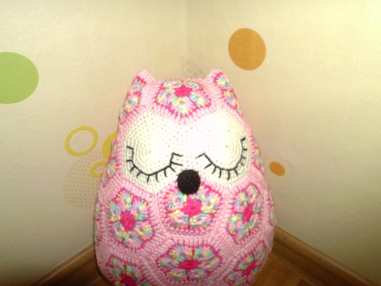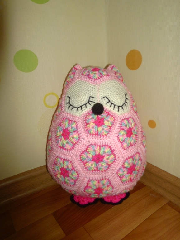 По просьбе старшей дочки связала ей на НГ в подарок сову-сплюшку. Нитки она подбирала сама,но результат еще не видела. Видела только мотив один. Сказала,что ее сову будут звать "Карамелька".Высота 35 см, ширина так же 35 см( объем пуза 70 см!!!). Такая толстушка)))