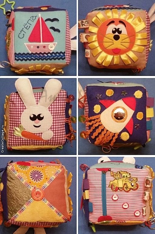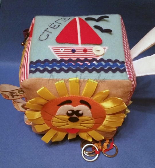 У кораблика парус на липучках, птички с подвижными крыльями. Львенка можно теребить за гриву, дергать за язык, изучать где глазки, носик, ротик. С зайцем можно играть в ку-ку, ушки у него шуршат.На ракете зеркальце, пламя подвижное, звездочки из разных тканей + бусины. Одна сторона просто с разными на ощупь тканями. Еще одна - молнии, пуговки, аппликация. По бокам грызунки, крупные бусины, ленточки, резиночки и т.п.